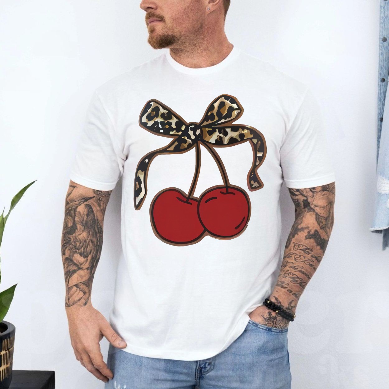 Cherry T-shirt – Cute Red Cherries with Leopard Print Bow Tee