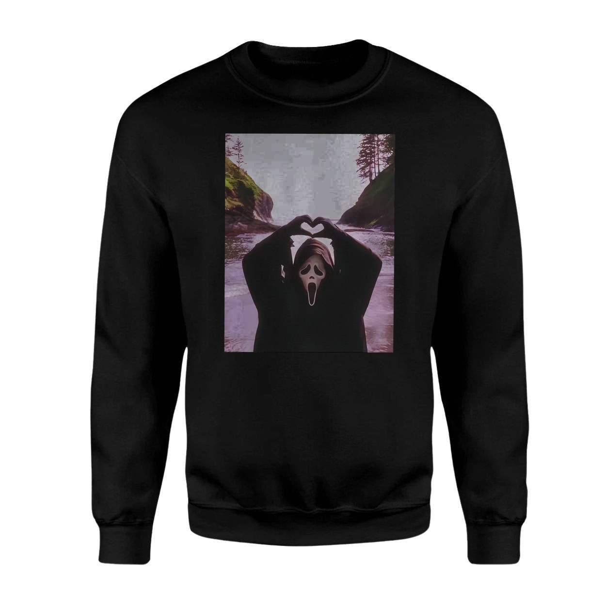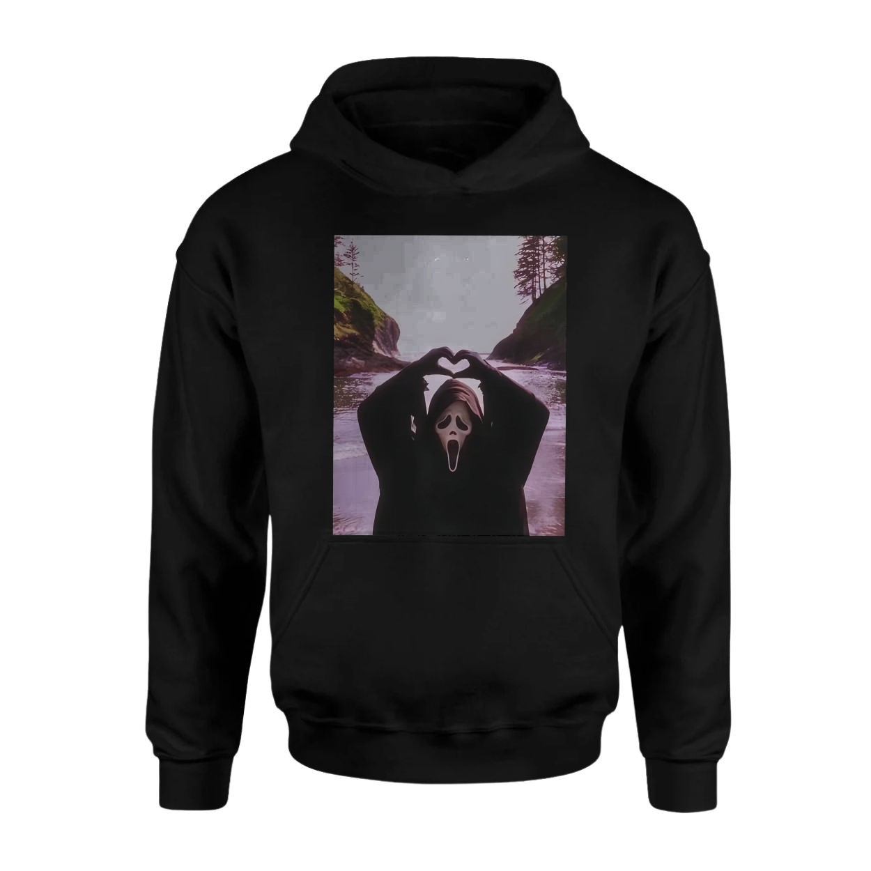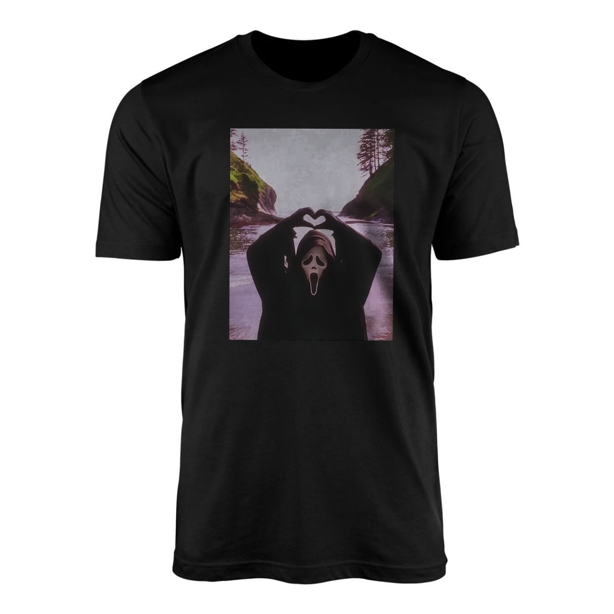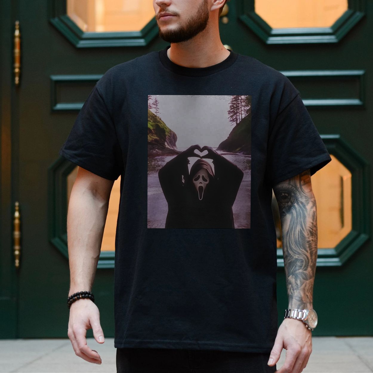 Funny Ghostface T-Shirt – Horror Beach Scene Heart Hands Meme Tee