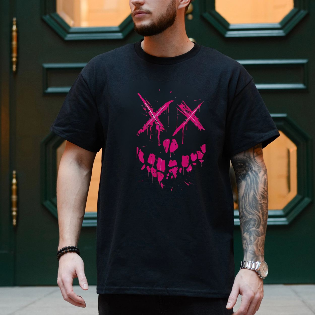 Neon Pink Smiley Face Distressed Halloween T-Shirt