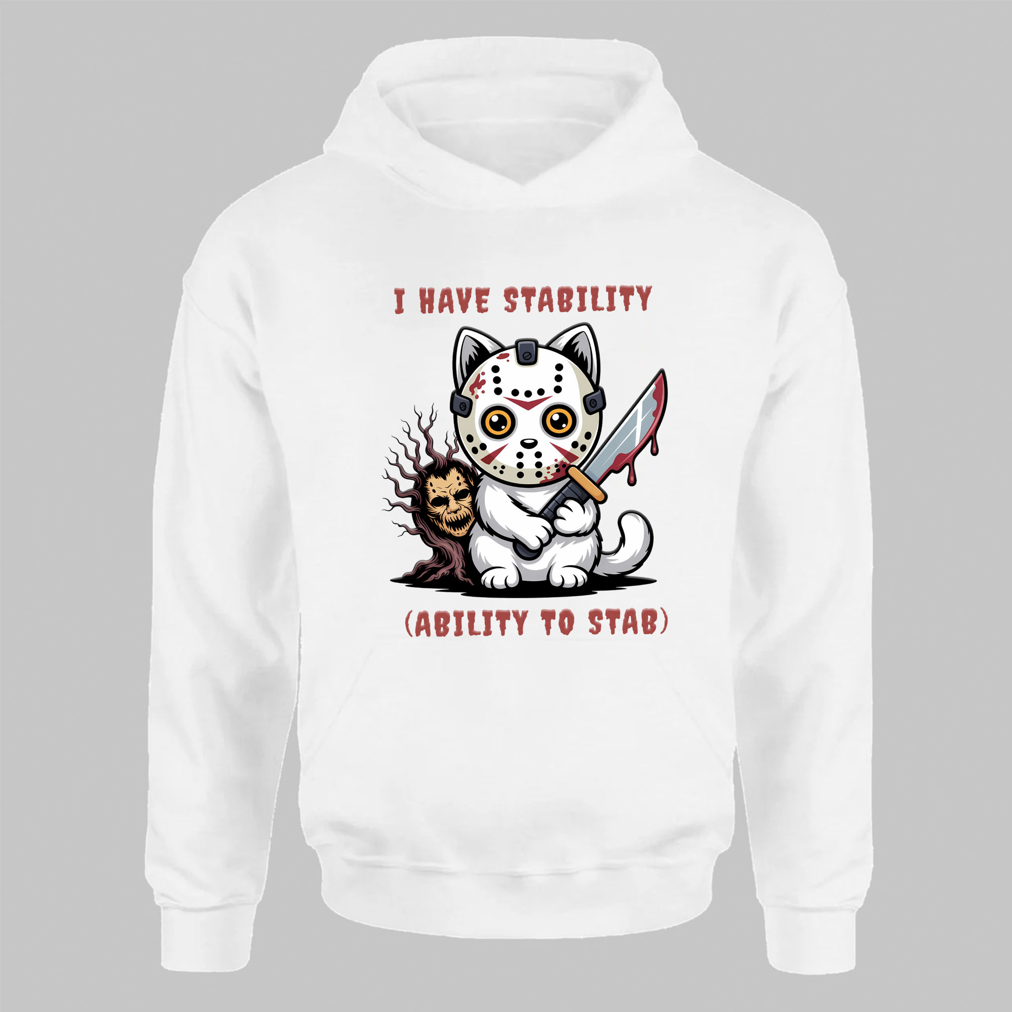 Stabby Cat Horror T-Shirt – Cute Killer Kitty with Jason Mask, Funny Halloween Graphic Tee