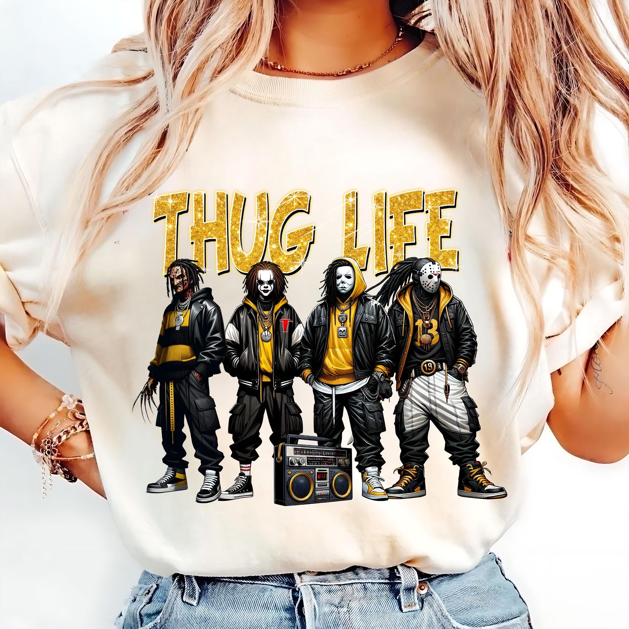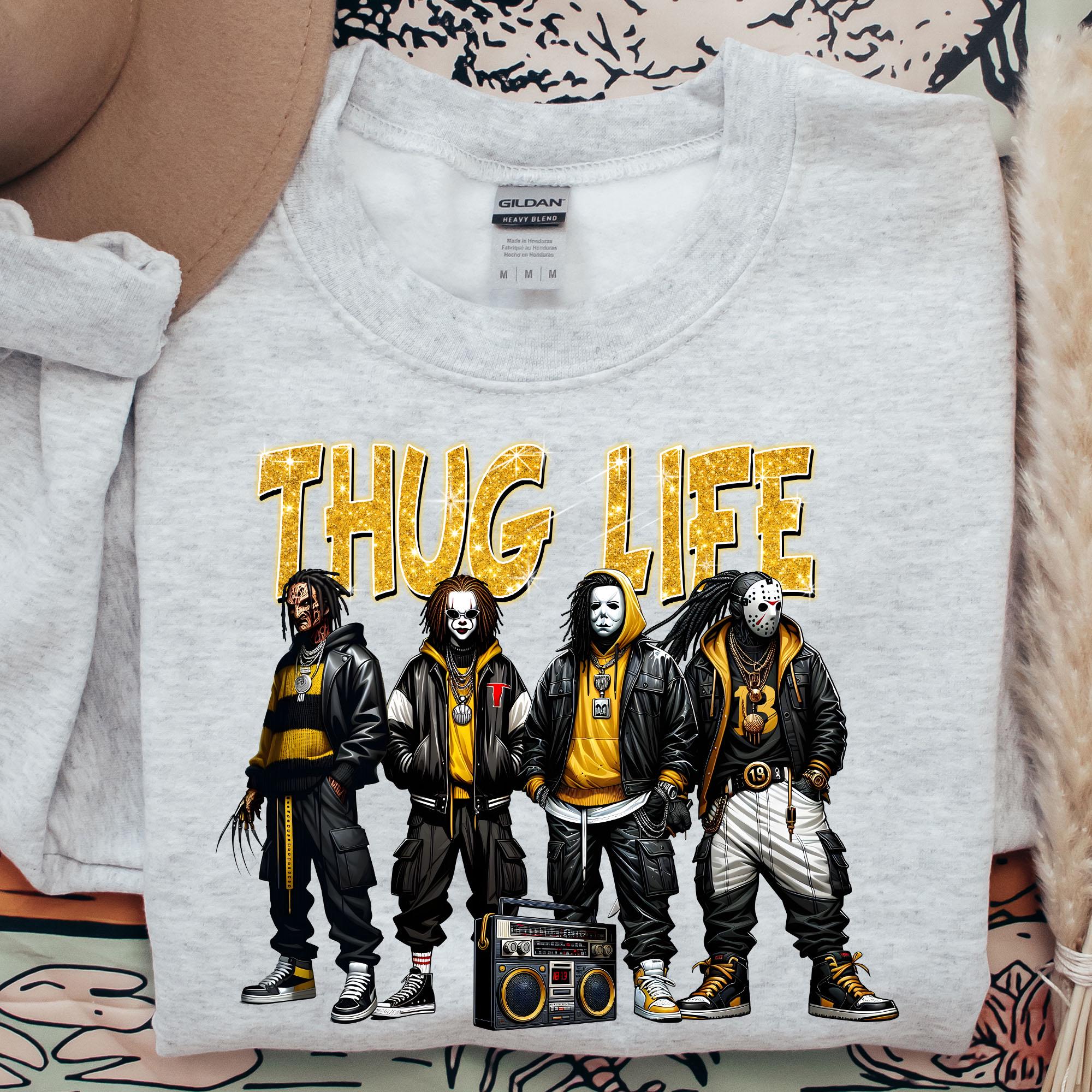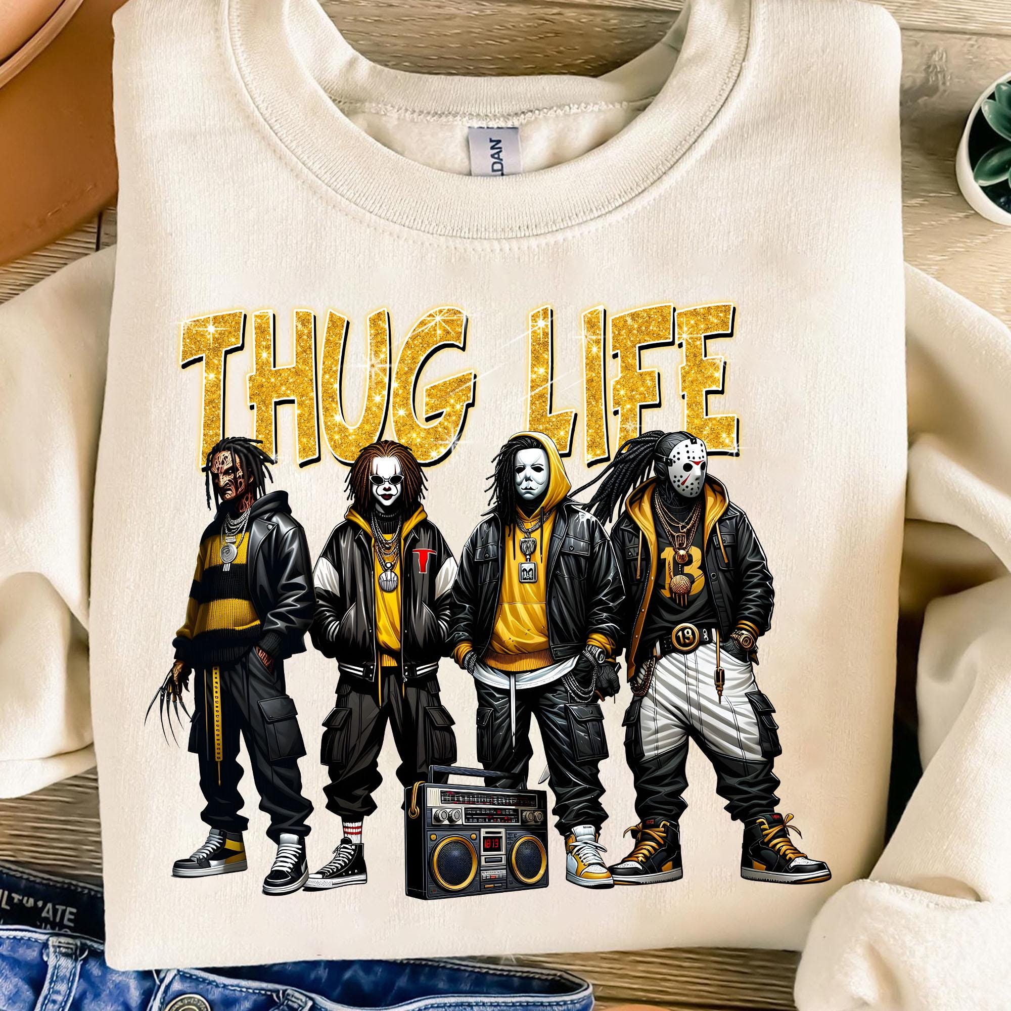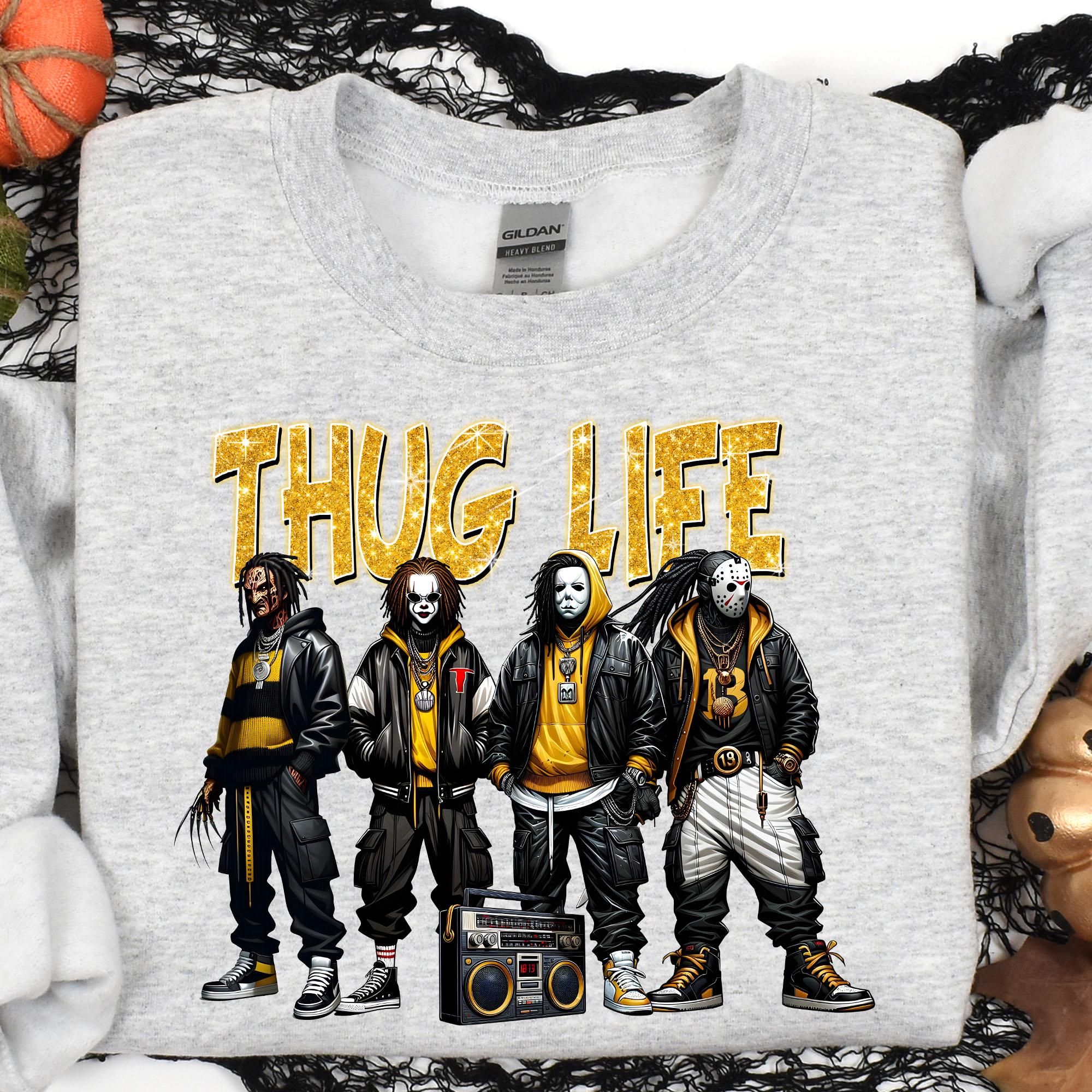 Thug Life Horror Icons Sweatshirt – Yellow Hip Hop Halloween Villains Tee